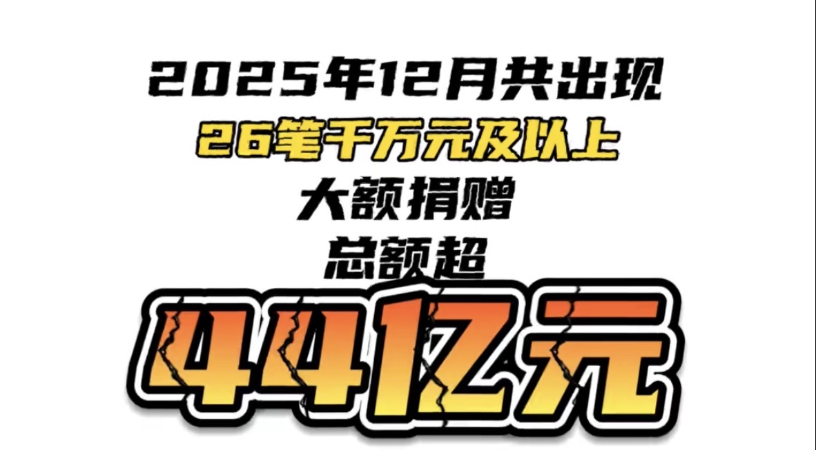 2025年12月大額捐贈(zèng)一覽:千萬(wàn)元及以上捐贈(zèng)超44億元,九成流向教育領(lǐng)域