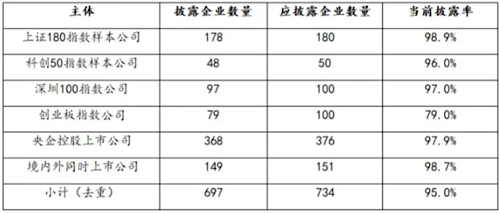 企研行高級分析師陳登立介紹,根據(jù)國資委的政策、證監(jiān)會和三大交易所的準則和指引,央企控股上市公司、境內(nèi)外同時上市、上證180指數(shù)樣本公司、科創(chuàng)50指數(shù)樣本公司、深圳100指數(shù)公司和創(chuàng)業(yè)板指數(shù)公司屬于強制披露主體,必須在披露季準時披露,創(chuàng)業(yè)板指數(shù)樣本公司有21家沒有落實。從上表中可以看出,強制披露的制度約束機制發(fā)生的作用,去重之后,“應批未批”的企業(yè)為37家,僅占5%。根據(jù)其與37家企業(yè)聯(lián)絡,這些企業(yè)很快也會披露。