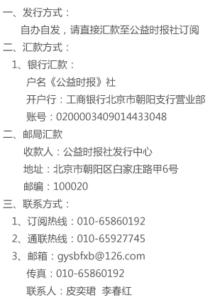 注:為能準(zhǔn)確及時收到報紙,請認(rèn)真填寫閱讀回執(zhí)后傳真或郵寄至公益時報社。 點擊此處下載報銷憑證和回執(zhí) |