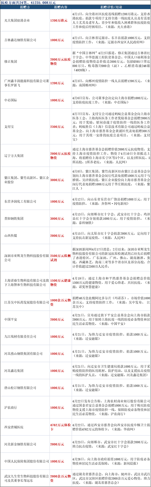 用于抗疫的捐贈(zèng)共24筆,總額為41235.008萬(wàn)元,涉及多個(gè)省市。