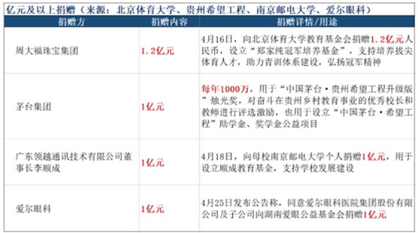 前三筆均為教育領(lǐng)域的捐贈(zèng)。