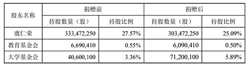 截至公告披露日,虞仁榮持有公司股份333472250股,占公司目前總股本的27.57%;公司股東教育基金會(huì)持有公司股份6690410股,占公司目前總股本的0.55%。此次捐贈(zèng)后,虞仁榮持股比例降至25.09%,教育基金會(huì)持股比例降至0.50%,大學(xué)基金會(huì)持股比例升至5.89%。