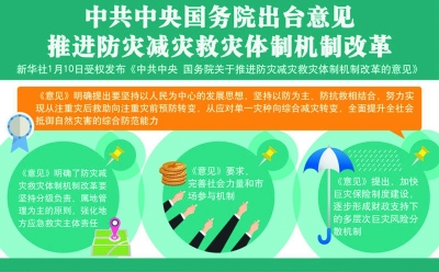 《中共中央 國務(wù)院關(guān)于推進(jìn)防災(zāi)減災(zāi)救災(zāi)體制機(jī)制改革的意見》1月10日公布。民政部相關(guān)負(fù)責(zé)人表示,《意見》著眼當(dāng)前我國防災(zāi)減災(zāi)救災(zāi)工作面臨的問題和體制機(jī)制方面的制約因素,通過頂層設(shè)計,針對三大體制機(jī)制完善升級提出了一系列改革舉措,有助于不斷提升我國防災(zāi)減災(zāi)救災(zāi)能力。