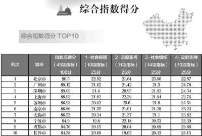 根據(jù)此次指數(shù)評估指標體系,選定從社會捐贈、志愿服務(wù)、社會組織、政府支持四個方面的數(shù)據(jù)和評分來綜合衡量一個城市的慈善事業(yè)發(fā)展水平。