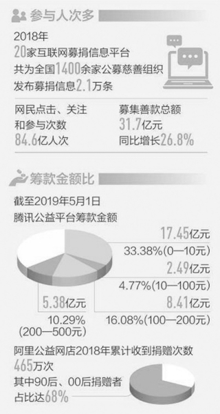 根據(jù)民政部公布的信息,2018年,由民政部根據(jù)《慈善法》指定的20家互聯(lián)網(wǎng)募捐信息平臺,共為全國1400余家公募慈善組織發(fā)布募捐信息2.1萬條,網(wǎng)民點擊、關(guān)注和參與次數(shù)超過84.6億人次,募集善款總額超過31.7億元,同比2017年增長26.8%。“互聯(lián)網(wǎng)公益讓優(yōu)秀的公益組織源源不斷地獲得公眾的捐款和支持。”南都公益基金會理事長徐永光說。