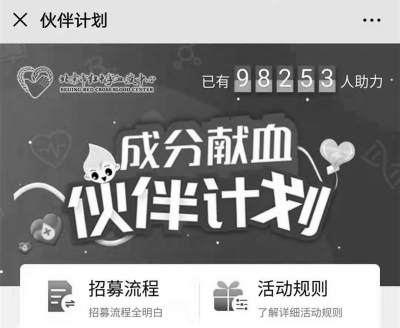 在無償獻血者的招募中,北京市紅十字血液中心也早早引入了“互聯(lián)網(wǎng)+”技術(shù),其中最為亮眼的莫過于首都成分獻血“伙伴計劃”項目。