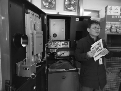 西歸浦市政府生活環(huán)境課Clean House組長梁根赫展示易拉罐、塑料瓶回收機器內(nèi)部