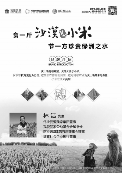 “這個項目的兩頭都是公益。”偉業(yè)我愛我家集團副總裁兼我愛我家公益基金會副理事長胡景暉在談起整個活動的創(chuàng)意時,自豪之情溢于言表,他說:“項目的一頭是阿拉善沙漠化治理的環(huán)保公益;一頭是動員經(jīng)紀人深入社區(qū)開展環(huán)保公益宣傳的社區(qū)環(huán)保公益。通過5萬名我愛我家經(jīng)紀人之手把‘沙漠小米’免費送給社區(qū)居民,讓更多居民了解阿拉善,從而動員更多的社會力量自愿加入到荒漠化治理的公益事業(yè)中來,更大力度地推動阿拉善的荒漠化治理。”