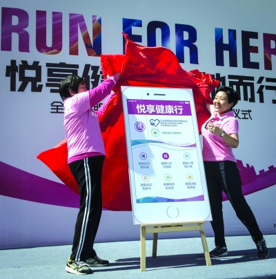 ▲上海羅氏制藥有限公司總經(jīng)理周虹與中國預防性病艾滋病基金會副理事長馬純鋼帶羅氏員工志愿者一同義走