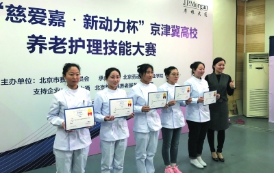 2018年3月30日,“慈愛(ài)嘉·新動(dòng)力杯”京津冀高校養(yǎng)老護(hù)理技能大賽在京舉行,這項(xiàng)賽事由北京市教育委員會(huì)發(fā)起,慈愛(ài)嘉聯(lián)合摩根大通(JP Morgan)共同支持,由北京勞動(dòng)保障職業(yè)學(xué)院承辦,京津冀7所高校的學(xué)生參加。