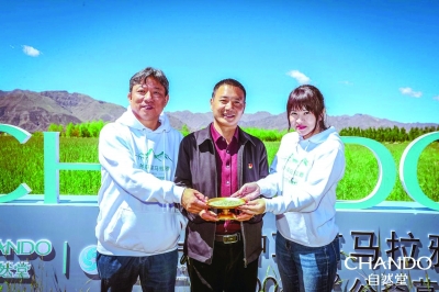 張波副縣長(zhǎng)(中)為自然堂公益一行贈(zèng)送草籽2019年7月,伽藍(lán)集團(tuán)公關(guān)傳播總經(jīng)理陳涓玲再次踏足西藏這片神圣的土地。