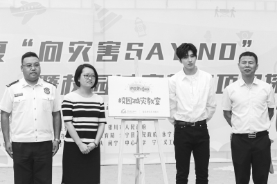 (左起)寧夏消防救援總隊(duì)防火監(jiān)督部宣傳處處長(zhǎng)趙志軍、永寧縣人民政府副縣長(zhǎng)馬燕、中國(guó)扶貧基金會(huì)減災(zāi)形象大使蔡徐坤和寧夏教育廳體育衛(wèi)生與藝術(shù)教育處調(diào)研員臧育海在校園減災(zāi)教室揭牌儀式上2019年8月2日,由中國(guó)扶貧基金會(huì)主辦,寧夏教育廳、寧夏扶貧開發(fā)辦公室、銀川市人民政府、銀川市扶貧開發(fā)辦公室、銀川市教育局、永寧縣人民政府、永寧縣教育局支持,寧夏氣象局、永寧夏消防救援大隊(duì)、閩寧鎮(zhèn)中心小學(xué)、寧夏義工聯(lián)合會(huì)協(xié)辦的“2019寧夏向?yàn)?zāi)害SAY NO活動(dòng)暨校園減災(zāi)教室項(xiàng)目探訪活動(dòng)”在寧夏永寧縣閩寧鎮(zhèn)中心小學(xué)舉辦。