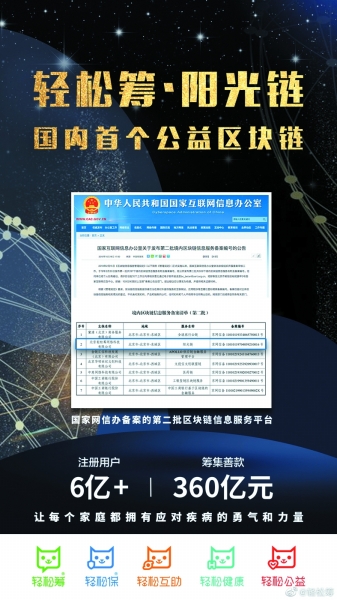 在自主研發(fā)的區(qū)塊鏈技術(shù)的加持下,輕松籌將區(qū)塊鏈技術(shù)、大數(shù)據(jù)技術(shù)、AI技術(shù)等多項(xiàng)科技創(chuàng)新應(yīng)用在公益事業(yè),聯(lián)合公益組織、醫(yī)院以及所有踐行公益事業(yè)的同行伙伴推出“陽(yáng)光鏈”,再一次開創(chuàng)了行業(yè)先河。“陽(yáng)光鏈”將大病救助、公益機(jī)構(gòu)及互助行動(dòng)的捐贈(zèng)記錄、資金流向公開透明,為公益事業(yè)及大病救助的發(fā)展指明了新的方向。