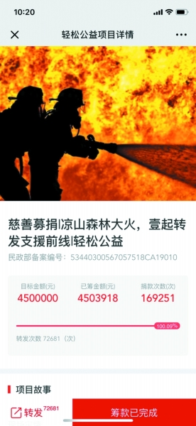 2019年3月30日,四川涼山發(fā)生重大森林火災(zāi),涼山消防隊(duì)員689人在海拔4000余米的原始森林展開撲救行動(dòng)。但撲救行動(dòng)中受到風(fēng)力風(fēng)向的突變影響,大火突發(fā)爆燃,消防員突遇險(xiǎn)情后部分人員失聯(lián)。緊急時(shí)刻,輕松公益上線壹基金“涼山森林大火,壹起轉(zhuǎn)發(fā)支援前線”公益項(xiàng)目,僅18小時(shí)就獲得17萬(wàn)網(wǎng)友的支持,火速籌滿善款450萬(wàn)元并第一時(shí)間送往前線。