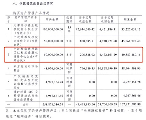 《財報》顯示,南都公益基金會購買資管產(chǎn)品共計6支,分別為:長期股權(quán)投資資管產(chǎn)品——“天津紅杉基業(yè)股權(quán)投資合伙企業(yè)(有限合伙)”投資金額1億元,投資期限15年;“寧波禹禾股權(quán)投資合伙企業(yè)(有限合伙)”投資金額5000萬元,投資期限7年;“寧波梅山保稅港區(qū)紅杉慧盛股權(quán)投資合伙企業(yè)(有限合伙)”投資金額5000萬元,投資期限8年。