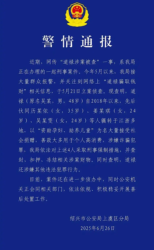近日,浙江省紹興市公安局上虞區(qū)分局的一則通報,將曾以“救助孕婦、收養(yǎng)棄嬰”聞名的道祿和尚推至輿論風(fēng)口浪尖。通報顯示,自2018年起,道祿伙同他人借“資助孕婦、助養(yǎng)兒童”之名吸納社會捐贈,卻將巨額善款用于個人高消費,目前其已因涉嫌詐騙犯罪被采取刑事強制措施。