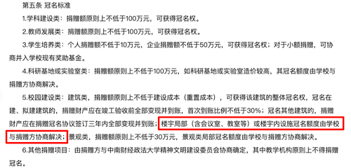 記者注意到,該管理辦法第四條“冠名范圍”明確,校園建設(shè)類冠名包括:建筑類,已建、在建或擬建建筑物整體或樓宇局部,如體育場(chǎng)館、會(huì)議室、教室等;景觀類,廣場(chǎng)、道路、橋梁、綠化景點(diǎn)等。第五條“冠名標(biāo)準(zhǔn)”中明確,樓宇局部(含會(huì)議室、教室等)或樓宇內(nèi)設(shè)施冠名額度由學(xué)校與捐贈(zèng)方協(xié)商解決。