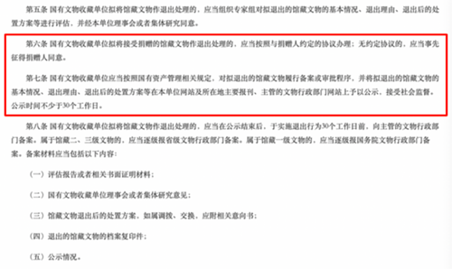 記者查詢到,2018年6月29日國家文物局公布的《國有館藏文物退出管理暫行辦法》第六條明確,國有文物收藏單位擬將接受捐贈的館藏文物作退出處理的,應當按照與捐贈人約定的協(xié)議辦理;無約定協(xié)議的,應當事先征得捐贈人同意。