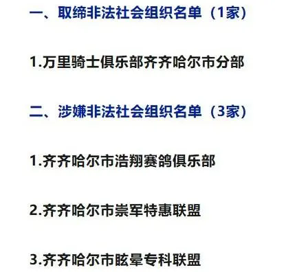 黑龍江省齊齊哈爾市民政局日前發(fā)布關(guān)于集中公布2025年第三批取締、涉嫌非法社會(huì)組織名單的通告。其中取締一家——萬(wàn)里騎士俱樂(lè)部齊齊哈爾市分部;涉嫌非法社會(huì)組織三家——齊齊哈爾市浩翔賽鴿俱樂(lè)部、齊齊哈爾市崇軍特惠聯(lián)盟、齊齊哈爾市眩暈??坡?lián)盟。