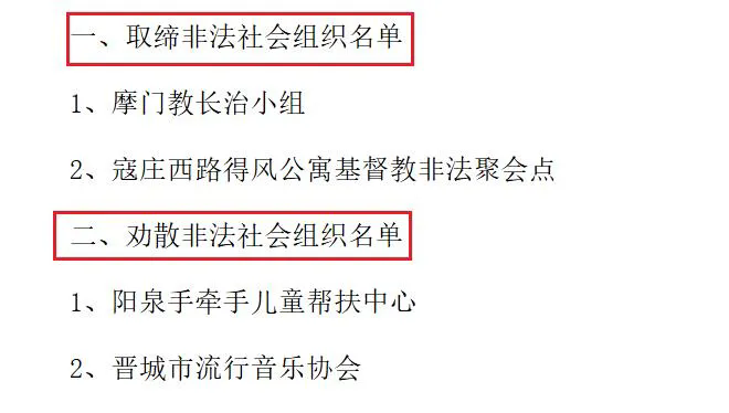 據(jù)山西省民政廳10月14日消息,山西省民政廳日前公布了一批依法取締和勸散的非法社會(huì)組織名單,其中取締兩家,包括摩門教長(zhǎng)治小組、寇莊西路得風(fēng)公寓基督教非法聚會(huì)點(diǎn);勸散兩家,包括陽(yáng)泉手牽手兒童幫扶中心、晉城市流行音樂(lè)協(xié)會(huì)。