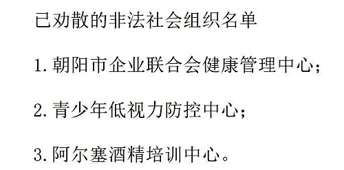 根據(jù)省、市相關(guān)工作部署,遼寧省朝陽(yáng)市雙塔區(qū)民政局深入推進(jìn)打擊整治非法社會(huì)組織專項(xiàng)行動(dòng),依法查處并勸散了一批非法社會(huì)組織,包括朝陽(yáng)市企業(yè)聯(lián)合會(huì)健康管理中心、青少年低視力防控中心、阿爾塞酒精培訓(xùn)中心。