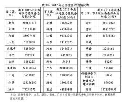 截至2017年底,全國共有1657個縣(市、區(qū))、14062個街(鎮(zhèn))、69651個社區(qū)和102931個單位開展了志愿服務記錄工作。各地累計志愿服務時間已超過13.7億小時。