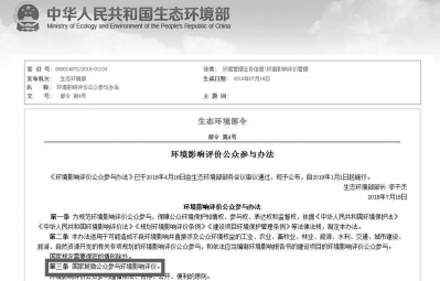 生態(tài)環(huán)境部近日印發(fā)了《環(huán)境影響評(píng)價(jià)公眾參與辦法》(以下簡稱《公參辦法》),于2019年1月1日起實(shí)施。
