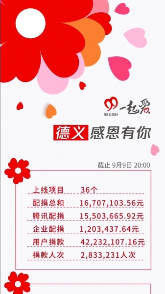 一年一度的99公益日落下帷幕。據(jù)騰訊公益披露數(shù)據(jù),今年9月7日至9月9日三天,共有超2800萬(wàn)人次愛(ài)心網(wǎng)友通過(guò)騰訊公益平臺(tái)捐出善款8.3億元,善款總計(jì)超過(guò)14.14億元。