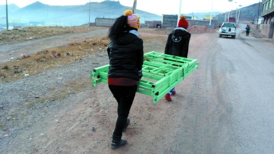 清晨的高原,薄霧還沒有散去,兩兩協(xié)作就已經(jīng)開始。大部分學校用品都是人工搬運的,每個學生來往2~3趟,每趟大概2公里。