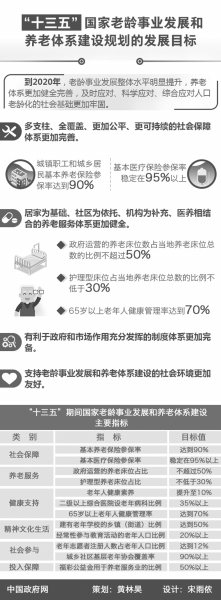 為應對老齡化問題,《規(guī)劃》提出了發(fā)展目標:到2020年,老齡事業(yè)發(fā)展整體水平明顯提升,養(yǎng)老體系更加健全完善,及時應對、科學應對、綜合應對人口老齡化的社會基礎更加牢固。