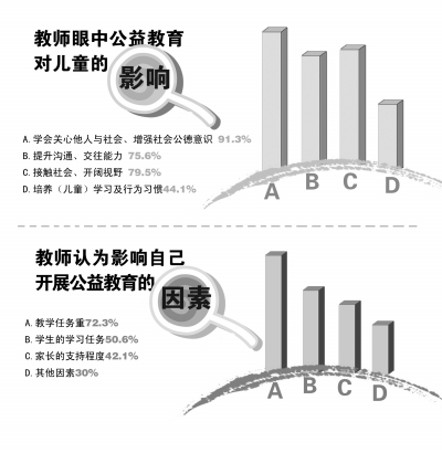 學(xué)校教育是影響青少年成長(zhǎng)的主導(dǎo)力量,學(xué)校是公益教育開展的重要場(chǎng)所和主體。學(xué)校教育中最為關(guān)鍵的要素是教師,教師對(duì)公益教育的認(rèn)識(shí)、認(rèn)同及開展公益教育的素養(yǎng)是決定學(xué)校公益教育開展情況的至關(guān)重要的因素。因此,在公益教育開展中,需要了解教師的有關(guān)情況,以準(zhǔn)確把握在中小學(xué)開展什么樣的公益教育,并有效地引導(dǎo)教師參與到公益教育中。 北京市海淀區(qū)位于北京城區(qū)西北部,其轄區(qū)內(nèi)約一半?yún)^(qū)域的學(xué)校為通常意義上的市區(qū)學(xué)校,另一半?yún)^(qū)域的學(xué)校為郊區(qū)或農(nóng)村學(xué)校;既有在北京市辦學(xué)層次處于一類的學(xué)校,也有辦學(xué)層次較低的學(xué)校。因此,在該區(qū)域選擇若干學(xué)校進(jìn)行調(diào)查具有較大的代表性。北京師范大學(xué)社會(huì)發(fā)展與公共政策研究院的公益教育研究所對(duì)該區(qū)21所學(xué)校的1000名教師進(jìn)行了公益教育方面的調(diào)研。調(diào)查發(fā)現(xiàn),目前小學(xué)教師對(duì)公益教育的了解和開展的公益教育有限。 公益認(rèn)知缺乏深度 大部分小學(xué)教師對(duì)公益有一定認(rèn)識(shí),但是不夠全面和深入。對(duì)“公益”的認(rèn)識(shí)主要局限在常識(shí)意義的理解上,偏重于“指向于他人的”,而缺乏指向于“集體”或“社會(huì)”的理解。 在“您認(rèn)為公益是 ”的多項(xiàng)選擇調(diào)查中,被選擇最多的選項(xiàng)是“為他人服務(wù)”,占教師總數(shù)的83.8%;次多的選項(xiàng)是“志愿精神”,72.9%的人選擇了這一項(xiàng),說(shuō)明了大部分認(rèn)為“公益”是一種自愿的行為,甚至有36.2%的人認(rèn)為公益是“犧牲自我、不求回報(bào)”的行為。有53.9%的教師認(rèn)為“公益”是“公共利益”。比較而言,認(rèn)為“公益”是“指向于他人的”人數(shù)比認(rèn)為是“公共利益”的人數(shù)多29.9%,接近三分之一。 對(duì)“公益教育”這一概念,有16.6%的人沒有聽說(shuō)過(guò),有69.8的人“了解一點(diǎn)”,兩項(xiàng)合計(jì)為“86.4%”;“比較了解”和“非常了解”的共占13.6%,說(shuō)明大部分教師雖然對(duì)“公益”一詞不陌生,但是對(duì)“公益教育”的了解較少。就目前的理解來(lái)說(shuō),認(rèn)為其與“品格、道德教育”最相似的教師比例最高,達(dá)到64.5%,有62.8%的人認(rèn)為其是“培養(yǎng)志愿精神”,一半左右的教師認(rèn)為其與“人文教育”、“公民教育”、“素質(zhì)教育”相似。 公益教育的實(shí)施有哪些作用?在公益對(duì)兒童的影響方面,教師更為看重“指向于他人”的方面,91.3%的教師認(rèn)為是讓學(xué)生“學(xué)會(huì)關(guān)心他人與社會(huì)”、“增強(qiáng)社會(huì)公德意識(shí)”,而選擇公益教育的影響是促進(jìn)孩子自身發(fā)展的“提升溝通、交往能力”和“接觸社會(huì)、開闊視野”的比例分別是75.6%和79.5%,認(rèn)為公益教育能夠“培養(yǎng)(兒童)學(xué)習(xí)及行為習(xí)慣”的教師僅有44.1%。 公益教育偏重人文類課程 大多數(shù)小學(xué)教師認(rèn)為公益教育的實(shí)施途徑主要為德育方面的課程與活動(dòng),是否能融入到其他學(xué)科教學(xué)之中,與這門課是否有活動(dòng)形式的教學(xué)有關(guān)系。 與上述關(guān)于公益及公益教育的認(rèn)識(shí)相關(guān)的是,“在哪些課程或活動(dòng)中體現(xiàn)公益教育”的調(diào)查中,有超過(guò)50%的教師認(rèn)為不能在品德課程、班會(huì)活動(dòng)或德育活動(dòng)之外的課程中進(jìn)行。 除了品德課程之外,認(rèn)為在語(yǔ)文學(xué)科中可以融入公益教育的教師最多,可能與語(yǔ)文的人文性是有關(guān)系的。在小學(xué)教育中,語(yǔ)文教育既擔(dān)負(fù)著工具性的教學(xué)讀寫等之外,還肩負(fù)著對(duì)學(xué)生進(jìn)行“人文”教育的任務(wù)。英語(yǔ)、數(shù)學(xué)、體育和科學(xué)被選擇得很少,這與教師關(guān)于這些學(xué)科的學(xué)科觀有關(guān)系。 深入分析,教師認(rèn)為一門課能否融入公益教育,與這門課是否有活動(dòng)形式的教學(xué)有關(guān)系,結(jié)合項(xiàng)目組的訪談內(nèi)容可發(fā)現(xiàn),大多數(shù)老師都認(rèn)同公益教育需要通過(guò)一系列有計(jì)劃的活動(dòng),才能將公益理念落實(shí)。 選擇“藝術(shù)”和“健康教育”的人數(shù)比語(yǔ)文之外的其他學(xué)科多,可能是因?yàn)樗囆g(shù)、健康教育中的活動(dòng)居多;選擇“科學(xué)”的明顯比選擇英語(yǔ)、數(shù)學(xué)、體育的教師多,也可能是因?yàn)檫@一學(xué)科中的活動(dòng)比其他學(xué)科多。 時(shí)間、精力、安全問(wèn)題突出 調(diào)查中發(fā)現(xiàn),目前中小學(xué)教師開展公益教育的情況較少,并且不同學(xué)校存在著較大差異。那么,教師開展公益教育與哪些因素相關(guān)呢?時(shí)間、精力、安全問(wèn)題是影響小學(xué)教師選擇開展公益教育的重要因素。這可能與他們關(guān)于公益教育主要以“活動(dòng)”形式開展的認(rèn)識(shí)是有關(guān)的,因?yàn)檎J(rèn)為是“活動(dòng)”,因而就認(rèn)為需要在正常課堂教學(xué)活動(dòng)之外安排單獨(dú)時(sh