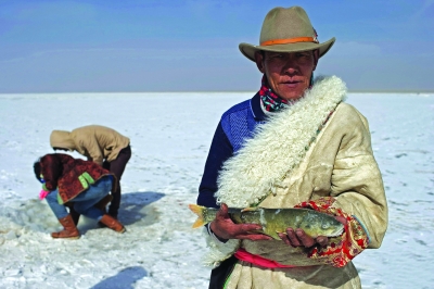 巡護(hù)隊(duì)員萬(wàn)瑪才讓小心地托著一條從網(wǎng)上摘下的足有30公分長(zhǎng)的湟魚。幸運(yùn)的是,這條湟魚還活著。他說(shuō),這條魚有幾十歲大了,非常珍貴。當(dāng)它被小心翼翼地放回冰洞,一扭身,瞬間在大家視線中消失時(shí),所有人鼓起掌來(lái)。 |