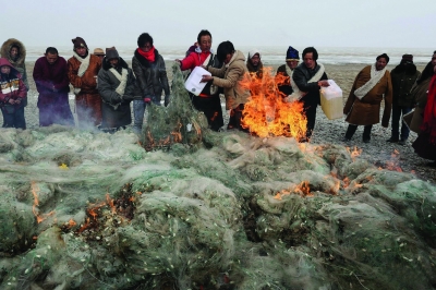 2015年2月4日,剛察縣,南加和當(dāng)?shù)氐难沧o(hù)隊(duì)員把近期收繳的魚網(wǎng),集中起來(lái)銷毀。 |