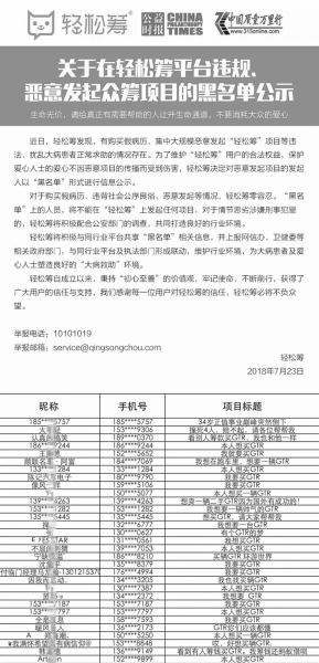 7月10日,輕松籌截獲并關閉該平臺個人求助版塊上于當日發(fā)起的“眾籌喪葬費”項目,將該違規(guī)項目籌集到的資金原路退回; 7月12日,輕松籌又截獲和關停在幾分鐘內發(fā)起的2000多例“購買GTR”“購買邁凱倫”等惡意籌款項目,對所涉資金進行凍結,并向公安機關報案…… 實際上,從大病眾籌平臺誕生至今的四年時間內,違規(guī)、惡意項目的發(fā)起時常困擾著各家平臺,消耗大眾的愛心的同時,也對大病救助這一領域的氛圍造成了負面影響,嚴重阻礙行業(yè)發(fā)展。 近日,面對今年接踵襲來的以假病歷發(fā)起項目、違規(guī)和惡意項目等事件,輕松籌決定正面著手解決這類困擾整個大病救助領域的“亂象”,推出“黑名單”機制,對惡意求助者采取“零容忍”態(tài)度,并與同行業(yè)平臺共享“黑名單”信息,以期共同為大病患者和愛心公眾塑造良好的大病救助環(huán)境。 第一份行業(yè)“黑名單” 7月23日,輕松籌發(fā)布我國第一份大病眾籌領域“黑名單”,將目前輕松籌個人求助版塊上惡意項目的發(fā)起人予以信息公示。 輕松籌表示,對于購買病歷、違背社會公序良俗、惡意發(fā)起等情況采取“零容忍”態(tài)度?!昂诿麊巍鄙系娜藛T,將不能在輕松籌上發(fā)起任何項目,對于情節(jié)惡劣涉嫌刑事犯罪的,輕松籌還將積極配合公安部門進行調查。 自2014年以來,隨著互聯(lián)網技術的不斷成熟,借助“熟人社交”的優(yōu)勢,數(shù)家大病眾籌平臺如雨后春筍般出現(xiàn),讓無力支付醫(yī)療費用的大病患者找到了生的希望,更讓公眾不斷擴大的愛心釋放需求得到滿足。 然而,4年來,也常有不符合發(fā)起條件的眾籌項目出現(xiàn)在各家平臺之上,更有甚者惡意發(fā)起違規(guī)項目,罔顧這一行為對大病救助領域的環(huán)境破壞。2016年實施的《慈善法》并未對個人求助領域進行規(guī)制,也一定程度上讓惡意發(fā)起者無所忌憚。 此次輕松籌發(fā)布“黑名單”是行業(yè)首度正面這一問題,極大增加了惡意發(fā)起者擾亂正常秩序的成本和難度,從而維護輕松籌用戶的合法權益,保護愛心人士的愛心不因惡意項目的傳播而受到傷害。 近探“黑名單” 記者發(fā)現(xiàn),“黑名單”首批記錄的500組信息中,其項目標題以含有“購買GTR”字樣居多,另有一些不堪入目的籌款請求,的確為惡意發(fā)起行為。 在此十余天前,輕松籌就曾于短短幾分鐘內接到大量“購買GTR”“購買邁凱倫”“購買帕拉梅拉”的惡意籌款項目申請,數(shù)量竟達到2000多例。平臺工作人員與發(fā)起者取得聯(lián)系時,不少人竟表示是為了“好玩兒”。輕松籌第一時間關停了這些項目、凍結所籌資金,并向公安機關報案。 與大多數(shù)大病眾籌平臺相似,輕松籌平臺的用戶在注冊時需填入有效手機號碼,此次“黑名單”所公示的手機號碼將不能再用于注冊和發(fā)起籌款項目,也就在很大程度上避免了惡意發(fā)起人再次注冊新ID來發(fā)起新項目,這將大規(guī)模減少惡意項目的申請。 此外,日前備受關注的“眾籌喪葬費”項目的發(fā)起人信息也被“黑名單”登記在案,這意味著,今后用戶在發(fā)起項目時需謹慎比照項目發(fā)起條件,莫將不屬于大病救助類別的籌款在平臺上發(fā)起。 輕松籌表示,個人籌款通道應為大病患者專用,目前平臺上每天都有很多患者和家庭在急切地等待幫助,應為他們讓出寶貴的生命通道。 推動行業(yè)共建相關機制 作為大病眾籌領域的領頭羊,輕松籌不但發(fā)布首份“黑名單”,更考慮到各家平臺對惡意項目的發(fā)起都深惡痛絕,決定將與同行業(yè)平臺共享“黑名單”相關信息,打造行業(yè)機制。 在該機制下,除分享“黑名單”信息外,輕松籌還將信息上報網信辦、衛(wèi)健委等相關政府部門。 輕松籌表示:“生命無價,請給真正有需要幫助的人讓開生命通道,不要消耗大眾的愛心。輕松籌將與與同行業(yè)平臺及執(zhí)法部門形成聯(lián)動,維護行業(yè)環(huán)境,為大病患者及愛心人士塑造良好的大病救助環(huán)境。’” ■ 本報記者 高文興 |