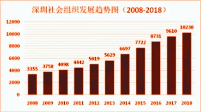 從登記數(shù)量來看,深圳市的社會(huì)組織總量從2008年的3355家,以11.79%的年平均增長(zhǎng)率增長(zhǎng)至2018年的10230家;每萬名常住人口擁有社會(huì)組織的數(shù)量從2008年的3.52個(gè),增長(zhǎng)到2018年的8.03個(gè),萬人社會(huì)組織擁有量居全國一線城市之首。