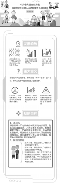 ■ 本報(bào)記者 王勇 為積極應(yīng)對人口老齡化,按照黨的十九大決策部署,近日,中共中央、國務(wù)院印發(fā)了《國家積極應(yīng)對人口老齡化中長期規(guī)劃》(以下簡稱《規(guī)劃》)?!兑?guī)劃》近期至2022年,中期至2035年,遠(yuǎn)期展望至2050年,是到本世紀(jì)中葉我國積極應(yīng)對人口老齡化的戰(zhàn)略性、綜合性、指導(dǎo)性文件。 《規(guī)劃》明確了積極應(yīng)對人口老齡化的戰(zhàn)略目標(biāo),即積極應(yīng)對人口老齡化的制度基礎(chǔ)持續(xù)鞏固,財(cái)富儲(chǔ)備日益充沛,人力資本不斷提升,科技支撐更加有力,產(chǎn)品和服務(wù)豐富優(yōu)質(zhì),社會(huì)環(huán)境宜居友好,經(jīng)濟(jì)社會(huì)發(fā)展始終與人口老齡化進(jìn)程相適應(yīng),順利建成社會(huì)主義現(xiàn)代化強(qiáng)國,實(shí)現(xiàn)中華民族偉大復(fù)興的中國夢。 到2022年,我國積極應(yīng)對人口老齡化的制度框架初步建立;到2035年,積極應(yīng)對人口老齡化的制度安排更加科學(xué)有效;到本世紀(jì)中葉,與社會(huì)主義現(xiàn)代化強(qiáng)國相適應(yīng)的應(yīng)對人口老齡化制度安排成熟完備。 《規(guī)劃》從5個(gè)方面部署了應(yīng)對人口老齡化的具體工作任務(wù)。 我國老齡化程度將持續(xù)加深 人口老齡化是社會(huì)發(fā)展的重要趨勢,是人類文明進(jìn)步的體現(xiàn),也是今后較長一段時(shí)期我國的基本國情。我國自20世紀(jì)末進(jìn)入老齡化社會(huì)以來,老年人口數(shù)量和占總?cè)丝诘谋戎爻掷m(xù)增長,2000年至2018年,60歲及以上老年人口從1.26億人增加到2.49億人,老年人口占總?cè)丝诘谋戎貜?0.2%上升至17.9%。未來一段時(shí)間,老齡化程度將持續(xù)加深。 國家發(fā)展改革委負(fù)責(zé)人就《國家積極應(yīng)對人口老齡化中長期規(guī)劃》答記者問時(shí)表示,積極應(yīng)對人口老齡化,是黨中央、國務(wù)院正確把握人口發(fā)展大趨勢和老齡化規(guī)律,作出的立足當(dāng)下、著眼長遠(yuǎn)的重大戰(zhàn)略部署,事關(guān)實(shí)現(xiàn)“兩個(gè)一百年”奮斗目標(biāo),事關(guān)實(shí)現(xiàn)中華民族偉大復(fù)興的中國夢,對于堅(jiān)持以人民為中心的發(fā)展思想、實(shí)現(xiàn)經(jīng)濟(jì)高質(zhì)量發(fā)展、維護(hù)國家安全和社會(huì)和諧穩(wěn)定,具有重大意義。 積極應(yīng)對人口老齡化是貫徹以人民為中心的發(fā)展思想的內(nèi)在要求;是實(shí)現(xiàn)經(jīng)濟(jì)高質(zhì)量發(fā)展的必要保障;是維護(hù)國家安全和社會(huì)和諧穩(wěn)定的重要舉措。 三大階段性目標(biāo) 據(jù)國家發(fā)展改革委負(fù)責(zé)人介紹,積極應(yīng)對人口老齡化的戰(zhàn)略總目標(biāo)是:積極應(yīng)對人口老齡化的制度基礎(chǔ)持續(xù)鞏固,財(cái)富儲(chǔ)備日益充沛,人力資本不斷提升,科技支撐更加有力,產(chǎn)品和服務(wù)豐富優(yōu)質(zhì),社會(huì)環(huán)境宜居友好,經(jīng)濟(jì)社會(huì)發(fā)展始終與人口老齡化進(jìn)程相適應(yīng),順利建成社會(huì)主義現(xiàn)代化強(qiáng)國,實(shí)現(xiàn)中華民族偉大復(fù)興的中國夢。 階段性目標(biāo)分別是:到2022年,積極應(yīng)對人口老齡化的制度框架初步建立。全員勞動(dòng)生產(chǎn)率平穩(wěn)增長,勞動(dòng)年齡人口平均受教育年限穩(wěn)步提升?;攫B(yǎng)老保險(xiǎn)和基本醫(yī)療保險(xiǎn)基本實(shí)現(xiàn)法定人員全覆蓋,養(yǎng)老保障水平正常調(diào)整機(jī)制初步建立。多層次養(yǎng)老保險(xiǎn)制度體系初步構(gòu)建,功能完善、規(guī)模適度、覆蓋城鄉(xiāng)、醫(yī)養(yǎng)結(jié)合的養(yǎng)老服務(wù)體系基本建成,老年宜居的社會(huì)環(huán)境初步建立。 到2035年,積極應(yīng)對人口老齡化的制度安排更加科學(xué)有效,社會(huì)財(cái)富儲(chǔ)備進(jìn)入高收入國家行列。全員勞動(dòng)生產(chǎn)率合理增長,總體實(shí)現(xiàn)教育現(xiàn)代化?;攫B(yǎng)老保險(xiǎn)和基本醫(yī)療保險(xiǎn)應(yīng)保盡保,實(shí)現(xiàn)法定人員全覆蓋。構(gòu)建起多層次養(yǎng)老保險(xiǎn)制度體系。主要健康指標(biāo)進(jìn)入高收入國家行列,人均預(yù)期壽命和健康預(yù)期壽命穩(wěn)步提升,老年人健康水平不斷提高,有序銜接、綜合連續(xù)的健康服務(wù)體系基本形成。中國特色養(yǎng)老服務(wù)體系成熟定型,全體老年人享有基本養(yǎng)老服務(wù)。國家創(chuàng)新能力躋身世界前列,科技對應(yīng)對人口老齡化的支撐作用顯著增強(qiáng)。老年友好型社會(huì)總體建成。 到本世紀(jì)中葉,與社會(huì)主義現(xiàn)代化強(qiáng)國相適應(yīng)的應(yīng)對人口老齡化制度安排成熟完備,老年友好城市、友好鄉(xiāng)村、友好社區(qū)遍布全國,全體人民生活更加幸福安康,中華民族實(shí)現(xiàn)偉大復(fù)興,以更加昂揚(yáng)的姿態(tài)屹立于世界民族之林。 五方面具體任務(wù) 《規(guī)劃》從5個(gè)方面部署了應(yīng)對人口老齡化的具體工作任務(wù)。 第一,夯實(shí)應(yīng)對人口老齡化的社會(huì)財(cái)富儲(chǔ)備。通過擴(kuò)大總量、優(yōu)化結(jié)構(gòu)、提高效益,實(shí)現(xiàn)經(jīng)濟(jì)發(fā)展與人口老齡化相適應(yīng)。通過完善國民收入分配體系,優(yōu)化政府、企業(y