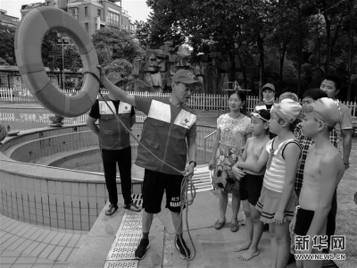 長(zhǎng)興縣紅十字會(huì)應(yīng)急救援人員教授如何用救生圈救溺水者。浙江省湖州市長(zhǎng)興縣雉城街道在水木花都社區(qū)開展“暑期防溺水教育進(jìn)社區(qū)”主題活動(dòng),用通俗易懂的方式在轄區(qū)的幼兒園、小學(xué)等開展溺水救援知識(shí)教學(xué),把相關(guān)應(yīng)急救援知識(shí)教給孩子和家長(zhǎng),為孩子們的暑期生活護(hù)航。