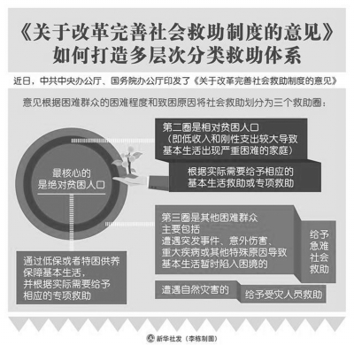 ■ 本報(bào)記者 王勇 近日,中共中央辦公廳、國務(wù)院辦公廳印發(fā)了《關(guān)于改革完善社會救助制度的意見》(以下簡稱《意見》)。民政部有關(guān)負(fù)責(zé)人就貫徹落實(shí)《意見》有關(guān)問題回答了記者的提問。民政部將會同有關(guān)部門采取有效措施,積極推動(dòng)《意見》貫徹落實(shí)。 社會救助發(fā)展不平衡不充分 社會救助事關(guān)困難群眾基本生活和衣食冷暖,關(guān)系民生、連著民心,是社會建設(shè)的兜底性、基礎(chǔ)性工作。黨的十八大以來,以習(xí)近平同志為核心的黨中央對社會救助工作作出一系列重大部署,2014年國務(wù)院頒布《社會救助暫行辦法》,確立了以最低生活保障、特困人員供養(yǎng)、受災(zāi)人員救助、醫(yī)療救助、教育救助、住房救助、就業(yè)救助、臨時(shí)救助為主體,社會力量參與為補(bǔ)充的“8+1”社會救助制度框架。各地區(qū)、各有關(guān)部門相應(yīng)出臺配套政策,不斷完善制度體系、健全體制機(jī)制,使社會救助在保障基本民生、打贏脫貧攻堅(jiān)戰(zhàn)、全面建成小康社會等方面發(fā)揮了重要作用。每年有近5000萬困難群眾得到基本生活救助,實(shí)施臨時(shí)救助1000多萬人次。近5年來,我國城市和農(nóng)村低保標(biāo)準(zhǔn)年均分別增長8.7%和14%。各專項(xiàng)救助也取得明顯成效。 但是,與新時(shí)代困難群眾對美好生活的向往相比,社會救助發(fā)展不平衡不充分的問題仍然較為突出。比如,一些救助政策和保障措施只覆蓋特困人員、低保對象;制度之間協(xié)調(diào)聯(lián)動(dòng)不夠,救助資源分散,救助信息不能互通共享,兜底保障安全網(wǎng)不夠嚴(yán)密;救助方式和供給主體單一,難以滿足困難群眾多樣化救助需求;一些地方投入不足,基層經(jīng)辦服務(wù)能力薄弱等。這些問題影響了困難群眾的獲得感、幸福感、安全感,是當(dāng)前基本民生兜底保障工作的短板和弱項(xiàng)。黨的十九大提出統(tǒng)籌城鄉(xiāng)社會救助體系,完善最低生活保障制度;黨的十九屆四中全會要求統(tǒng)籌完善社會救助制度,注重加強(qiáng)普惠性、基礎(chǔ)性、兜底性民生建設(shè),保障群眾基本生活,這為新時(shí)代改革完善社會救助制度指明了方向?!兑庖姟氛窃谶@樣的背景下制定出臺的。 保基本、兜底線、救急難、可持續(xù) 《意見》以習(xí)近平新時(shí)代中國特色社會主義思想為指導(dǎo),全面貫徹黨的十九大和十九屆二中、三中、四中全會精神,堅(jiān)持問題導(dǎo)向、目標(biāo)導(dǎo)向、效果導(dǎo)向相結(jié)合,按照保基本、兜底線、救急難、可持續(xù)的總體思路,提出了兜底保障基本民生的綜合改革舉措,是引領(lǐng)新時(shí)代社會救助事業(yè)高質(zhì)量發(fā)展的重要指導(dǎo)性文件,確定的目標(biāo)原則和改革任務(wù)充分考慮了未來一個(gè)時(shí)期我國社會救助制度的發(fā)展趨勢及時(shí)代要求。 一是有效銜接扶貧開發(fā)政策,確保2020年打贏脫貧攻堅(jiān)戰(zhàn),為完全喪失勞動(dòng)能力和部分喪失勞動(dòng)能力且依靠產(chǎn)業(yè)就業(yè)幫扶無法脫貧的困難群眾提供兜底保障,鞏固脫貧攻堅(jiān)成果;二是堅(jiān)持問題導(dǎo)向,在兜底線、織密網(wǎng)、建機(jī)制上完善政策制度,形成基本民生保障長效機(jī)制;三是根據(jù)新時(shí)代我國社會主要矛盾已經(jīng)轉(zhuǎn)化的實(shí)際,聚焦特殊群體,回應(yīng)群眾關(guān)切,增強(qiáng)社會救助的精準(zhǔn)識別和反應(yīng)能力,使有需要的困難群眾都能得到及時(shí)救助;四是適應(yīng)我國經(jīng)濟(jì)發(fā)展新常態(tài),科學(xué)確定救助標(biāo)準(zhǔn)和水平。 按照上述思路,《意見》以統(tǒng)籌救助資源、增強(qiáng)兜底功能、提升服務(wù)能力為重點(diǎn),提出了一攬子改革措施。主要內(nèi)容分為三個(gè)部分。第一部分是總體要求,提出新時(shí)代我國社會救助發(fā)展的指導(dǎo)思想、基本原則和總體目標(biāo)。第二部分是改革完善社會救助制度的重點(diǎn)任務(wù),分別從建立分層分類的社會救助體系、夯實(shí)基本生活救助、健全專項(xiàng)社會救助、完善急難社會救助、促進(jìn)社會力量參與、深化“放管服”改革等方面提出一系列具體改革措施。第三部分從加強(qiáng)組織領(lǐng)導(dǎo)、落實(shí)部門責(zé)任、提高基層服務(wù)能力、加強(qiáng)監(jiān)督檢查等方面明確落實(shí)《意見》的保障措施。 七方面創(chuàng)新 《意見》以統(tǒng)籌救助資源、增強(qiáng)兜底功能、提升服務(wù)能力為重點(diǎn),在政策設(shè)計(jì)和制度安排上有不少創(chuàng)新舉措,最突出的有以下幾個(gè)方面: 一是構(gòu)建綜合救助格局。《意見》要求加快構(gòu)建政府主導(dǎo)、社會參與、制度健全、政策銜接、兜底有力的綜合救助格局。以基本生活救助、專項(xiàng)社會救助、急難社會救助為主體,社會力量參與為補(bǔ)充,建立健全分層分類的救助制度體系,實(shí)現(xiàn)精準(zhǔn)救助、高效救助、溫暖救助、智慧救助。 二是打造多層次分類救助體系。《意見》根據(jù)困難群眾的困難程度和致困原因?qū)⑸鐣戎鷦澐譃槿齻€(gè)救助圈:最核心的是絕對貧困人口,通過低保或者特困供養(yǎng)保障基本生活,并根據(jù)實(shí)際需