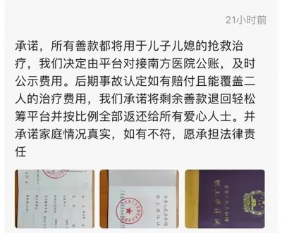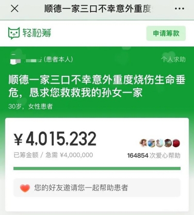 兩家人、同一車出行,不料遭遇汽車起火意外事故。日前,廣東佛山兩條來(lái)自輕松籌的籌款鏈接很快吸引數(shù)十萬(wàn)人捐款,兩個(gè)遭遇不測(cè)的家庭600萬(wàn)元的籌資目標(biāo)迅速完成。 在大家接力“慷慨解囊”的同時(shí),一些質(zhì)疑的聲音也開(kāi)始出現(xiàn)。對(duì)此,記者采訪當(dāng)事人家屬及平臺(tái),對(duì)這一事件進(jìn)行調(diào)查。 兩家人同車出行 遭遇意外事故被燒傷 8月9日晚,一條名為“順德一家三口不幸意外重度燒傷生命垂危,懇求您救救我孫女一家”的第三方籌款鏈接,刷爆了廣東省佛山市順德區(qū)的市民朋友圈。 “看著可愛(ài)的孫女躺在病床上奄奄一息的樣子,我的心就像被刀切碎了一樣。”發(fā)起求助的,是其中一位女性傷者的父親。 這位父親稱,今年8月8日中午1時(shí),女兒一家在乘車中突然意外遭遇火災(zāi)造成特重度燒傷,隨后送到了醫(yī)院搶救。 求助鏈接放上了其女兒、女兒丈夫及孫女的燒傷治療照。病床上的傷者全身包裹著繃帶。鏈接上,發(fā)起求助者還公布了一家人的傷情,并曬出了醫(yī)院相關(guān)診斷書(shū)。其女兒何某全身多處特重度燒傷90%,孫女全身多處特重度燒傷85%,其女婿梁某則是頭部、四肢重度燒傷40%,傷情嚴(yán)重。 值得關(guān)注的是,在鏈接發(fā)出后當(dāng)晚,數(shù)小時(shí)400萬(wàn)元款項(xiàng)就籌集完畢。 同車遭遇意外燒傷的還有另一家人。第二天(8月10日)傍晚,這一家人的籌資救助的鏈接也開(kāi)始出現(xiàn)在市民的朋友圈上。據(jù)悉,其籌資目標(biāo)為200萬(wàn)元。 發(fā)起救助的是傷者之一的父親。他稱,其兒子一家與另一家是“開(kāi)著借用的車”出行,隨后突然出現(xiàn)意外(交警和消防正在調(diào)查起火事故原因)?!皟H僅幾秒鐘時(shí)間車廂里滿是火焰,兒子到第三排抱著我的小孫女拖著兒媳下車,孫女在爸爸的保護(hù)下面部、手臂和腿部也均有輕度燒傷,但夫妻兩人卻被大火包圍造成重度燒傷,所乘車輛也被燒成了空架子?!?/p> 鏈接上,求助者也放出了一家的救治照片,附上了診斷證明。據(jù)悉,這一家男性傷者徐某全身各處重度燒傷50%,其妻子盧某全身重度燒傷30%。而經(jīng)過(guò)一晚上,200萬(wàn)元善款也籌資完成。 關(guān)于家庭財(cái)產(chǎn) “我說(shuō)得實(shí)事求是” 接連兩天,佛山全社會(huì)為兩個(gè)家庭共籌資超過(guò)600萬(wàn)元。記者了解到,在大家接力“慷慨解囊”的同時(shí),關(guān)于傷者家庭真實(shí)情況等一些質(zhì)疑的聲音開(kāi)始出現(xiàn)。 針對(duì)質(zhì)疑,10日,輕松籌平臺(tái)上更新了一份關(guān)于傷者家庭財(cái)產(chǎn)情況的證明。記者看到,在證明文末的一行“經(jīng)核實(shí),該家庭為我社區(qū)非低保家庭,非低保臨界家庭”手寫(xiě)字樣上,蓋上了傷者梁某所在居委會(huì)印章。 證明還提及了傷者梁某夫妻在北滘坤洲開(kāi)設(shè)一間加工作坊,有一幢自建房,有一臺(tái)小轎車等。 對(duì)此,記者也第一時(shí)間就該份證明向蓋章單位進(jìn)行核實(shí)。據(jù)其所在的碧江村委會(huì)相關(guān)負(fù)責(zé)人介紹,該證明確實(shí)是經(jīng)居委會(huì)之手。 8月11日,記者找到了遭遇事故家庭之一傷者梁某的親哥哥。他回應(yīng)稱,對(duì)于網(wǎng)上提及的一些質(zhì)疑聲音,自己實(shí)話實(shí)說(shuō),“光明正大”。 “我弟弟的情況全都是真實(shí)的?!绷耗车母绺邕€表示,關(guān)于一些質(zhì)疑的聲音,自己暫時(shí)無(wú)暇顧及。當(dāng)務(wù)之急要籌資救人,讓家人脫離危險(xiǎn)?!俺霈F(xiàn)這樣的變故,誰(shuí)都不愿意接受。” 關(guān)于治療費(fèi)用 “做好了賣房的準(zhǔn)備” 梁某的哥哥透露,當(dāng)前弟弟一家暫未脫離生命危險(xiǎn)。近段時(shí)間來(lái),除安撫、陪伴傷者家庭,他還奔走在保險(xiǎn)公司、社保部門等,爭(zhēng)取更多權(quán)益。 因?yàn)椴辉诩本鹊谝滑F(xiàn)場(chǎng),梁某哥哥表示對(duì)上眾籌平臺(tái)一事了解不多,但也就緣何籌資400萬(wàn)元進(jìn)行了回應(yīng)。 他稱,據(jù)收治其弟媳的廣州市紅十字會(huì)醫(yī)院給出的治療方案,全部治療費(fèi)用“保底”也要200萬(wàn)元?!暗艿芎椭杜谀戏结t(yī)院,現(xiàn)在還沒(méi)脫離危險(xiǎn)期,醫(yī)院表示還無(wú)法給出具體的治療費(fèi)用。但是我坦誠(chéng)說(shuō),400萬(wàn)元肯定是不夠的?!?/p> “我們已經(jīng)做好準(zhǔn)備了,將全部身家都拿出來(lái),用來(lái)救人。”梁某哥哥回應(yīng)記者,一家人已經(jīng)做好了“最壞打算”?!耙劝盐业艿姆孔淤u了,如果還不夠的話,就把我爸的一個(gè)房子拿出來(lái)賣了,現(xiàn)在已經(jīng)做好這樣的準(zhǔn)備了?!彼€表示,目前一家人也在等待事故原因的查明。 該籌款鏈接也發(fā)出了新的籌款動(dòng)態(tài)。其中上傳了三名患者費(fèi)用診斷證明,表示前期合計(jì)320萬(wàn)元費(fèi)用缺口。 平臺(tái)回應(yīng) 已觸發(fā)“風(fēng)控機(jī)制” 在眾籌過(guò)程中,不少網(wǎng)友也對(duì)平臺(tái)提出質(zhì)疑,包括材料審核、籌款修改等。 8月10日,輕松籌平臺(tái)經(jīng)過(guò)內(nèi)部調(diào)查,并通過(guò)采訪函回復(fù)記者,此次順德燒傷家庭的籌款事宜,是輕松籌籌款顧問(wèn)在醫(yī)院遇到了發(fā)起人,在發(fā)起人表