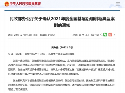 為進(jìn)一步總結(jié)推廣各地基層治理實(shí)踐創(chuàng)新經(jīng)驗(yàn)做法,宣傳展示各地加強(qiáng)基層治理進(jìn)展成效,營(yíng)造全面推進(jìn)基層治理體系和治理能力現(xiàn)代化建設(shè)的良好氛圍,2021年,民政部面向各地征集基層治理創(chuàng)新典型案例。在各地認(rèn)真組織申報(bào)的基礎(chǔ)上,確認(rèn)北京市朝陽(yáng)區(qū)實(shí)施“社區(qū)成長(zhǎng)伙伴計(jì)劃”探索超大城市社區(qū)治理創(chuàng)新路徑等27個(gè)案例為2021年度全國(guó)基層治理創(chuàng)新典型案例。 各地要認(rèn)真學(xué)習(xí)借鑒全國(guó)基層治理創(chuàng)新典型案例,鼓勵(lì)引導(dǎo)基層創(chuàng)新,因地制宜組織開(kāi)展本地基層治理創(chuàng)新經(jīng)驗(yàn)征集,探索形成符合本地實(shí)際的基層治理模式,通過(guò)典型示范加快推進(jìn)基層治理體系和治理能力現(xiàn)代化建設(shè)。 以下為2021年度全國(guó)基層治理創(chuàng)新典型案例名單: 1.北京市朝陽(yáng)區(qū):實(shí)施“社區(qū)成長(zhǎng)伙伴計(jì)劃”探索超大城市社區(qū)治理創(chuàng)新路徑 2.北京市昌平區(qū):實(shí)施公共服務(wù)設(shè)施提升三年行動(dòng)計(jì)劃破解回天地區(qū)治理難題 3.吉林省琿春市:聚力攻堅(jiān)打造專業(yè)化職業(yè)化社區(qū)工作者隊(duì)伍 4.上海市浦東新區(qū):建設(shè)“家門(mén)口”服務(wù)體系“繡”出高品質(zhì)社區(qū)服務(wù) 5.江蘇省南京市鼓樓區(qū):以居民滿意度考評(píng)機(jī)制推動(dòng)街道服務(wù)管理再創(chuàng)新 6.江蘇省無(wú)錫市新吳區(qū)旺莊街道:實(shí)施“益動(dòng)旺莊”成長(zhǎng)計(jì)劃探索社區(qū)工作者階梯式培養(yǎng)新模式 7.浙江省杭州市西湖區(qū):以民生綜合體打造社區(qū)服務(wù)體系建設(shè)新樣本 8.浙江省麗水市蓮都區(qū):陽(yáng)光票決制助推農(nóng)村社區(qū)治理創(chuàng)新 9.浙江省寧波市江北區(qū):“一件事”集成改革激發(fā)基層治理新動(dòng)能 10.福建省廈門(mén)市思明區(qū):打造“近鄰社區(qū)”促進(jìn)社區(qū)共建共治共享 11.山東省平邑縣:黨建統(tǒng)領(lǐng)“三治”結(jié)合構(gòu)建城鄉(xiāng)社區(qū)治理新體系 12.山東省東營(yíng)市東營(yíng)區(qū):六維雙向融合,油地共建共享,創(chuàng)新打造社區(qū)治理共同體 13.江西省南昌市西湖區(qū):“幸福圓桌會(huì)”提升社區(qū)治理精細(xì)化水平 14.河南省新鄉(xiāng)市紅旗區(qū):創(chuàng)新場(chǎng)景拓寬社區(qū)治理全新路徑 15.湖北省宜都市:村規(guī)民約為農(nóng)村社區(qū)治理添活力 16.湖南省湘潭市雨湖區(qū):強(qiáng)基礎(chǔ)促合力加強(qiáng)鄉(xiāng)鎮(zhèn)(街道)服務(wù)能力建設(shè) 17.廣東省佛山市禪城區(qū):“大數(shù)據(jù)·微服務(wù)”構(gòu)建社區(qū)治理服務(wù)新模式 18.廣東省東莞市:以“民生大莞家”推進(jìn)鄉(xiāng)鎮(zhèn)政府服務(wù)能力提檔升級(jí) 19.廣西壯族自治區(qū)柳州市柳南區(qū):規(guī)范基層協(xié)商促進(jìn)街道治理提質(zhì)增效 20.廣西壯族自治區(qū)來(lái)賓市興賓區(qū)橋鞏鎮(zhèn)毛塘村:“五清單、六步驟”創(chuàng)新村級(jí)議事協(xié)商實(shí)踐 21.重慶市江津區(qū):構(gòu)建簡(jiǎn)約高效體制提升鄉(xiāng)鎮(zhèn)治理能力 22.重慶市九龍坡區(qū)石坪橋街道:專項(xiàng)基金推進(jìn)社區(qū)治理共治融合創(chuàng)新 23.四川省成都市金牛區(qū):黨建引領(lǐng)提案工作機(jī)制激發(fā)社區(qū)治理內(nèi)生動(dòng)力 24.四川省漢源縣:央企協(xié)同趟出瀑電庫(kù)區(qū)基層治理新路子 25.貴州省凱里市:創(chuàng)新“村社宜站”加強(qiáng)村綜合服務(wù)能力建設(shè) 26.陜西省寶雞市陳倉(cāng)區(qū):“三辦”并舉促進(jìn)鄉(xiāng)鎮(zhèn)政府服務(wù)見(jiàn)實(shí)效 27.寧夏回族自治區(qū)中寧縣:疏堵結(jié)合著力破解社區(qū)“萬(wàn)能章”頑瘴痼疾 (據(jù)民政部官網(wǎng)) |