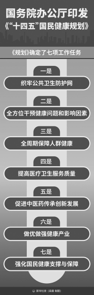 國(guó)務(wù)院辦公廳日前印發(fā)《‘十四五’國(guó)民健康規(guī)劃》(以下簡(jiǎn)稱《規(guī)劃》)。《規(guī)劃》提出,到2025年,公共衛(wèi)生服務(wù)能力顯著增強(qiáng),一批重大疾病危害得到控制和消除,醫(yī)療衛(wèi)生服務(wù)質(zhì)量持續(xù)改善,醫(yī)療衛(wèi)生相關(guān)支撐能力和健康產(chǎn)業(yè)發(fā)展水平不斷提升,國(guó)民健康政策體系進(jìn)一步健全,人均預(yù)期壽命在2020年基礎(chǔ)上繼續(xù)提高1歲左右。 《規(guī)劃》指出,“十四五”時(shí)期衛(wèi)生健康工作堅(jiān)持以習(xí)近平新時(shí)代中國(guó)特色社會(huì)主義思想為指導(dǎo),把人民群眾生命安全和身體健康放在第一位,全面推進(jìn)健康中國(guó)建設(shè),加快實(shí)施健康中國(guó)行動(dòng),深化醫(yī)藥衛(wèi)生體制改革,持續(xù)推動(dòng)發(fā)展方式從以治病為中心轉(zhuǎn)變?yōu)橐匀嗣窠】禐橹行?,為群眾提供全方位全周期健康服?wù)。 《規(guī)劃》確定了七項(xiàng)工作任務(wù)。一是織牢公共衛(wèi)生防護(hù)網(wǎng)。提高疾病預(yù)防控制能力,完善監(jiān)測(cè)預(yù)警機(jī)制,健全應(yīng)急響應(yīng)和處置機(jī)制,提高重大疫情救治能力。二是全方位干預(yù)健康問(wèn)題和影響因素。普及健康生活方式,加強(qiáng)傳染病、寄生蟲病和地方病防控,強(qiáng)化慢性病綜合防控和傷害預(yù)防干預(yù),完善心理健康和精神衛(wèi)生服務(wù),維護(hù)環(huán)境健康與食品藥品安全,深入開展愛(ài)國(guó)衛(wèi)生運(yùn)動(dòng)。三是全周期保障人群健康。完善生育和嬰幼兒照護(hù)服務(wù),保護(hù)婦女和兒童健康,促進(jìn)老年人健康,加強(qiáng)職業(yè)健康保護(hù),保障脫貧地區(qū)和殘疾人等相關(guān)重點(diǎn)人群健康服務(wù)。四是提高醫(yī)療衛(wèi)生服務(wù)質(zhì)量。優(yōu)化醫(yī)療服務(wù)模式,加強(qiáng)醫(yī)療質(zhì)量管理,加快補(bǔ)齊服務(wù)短板。五是促進(jìn)中醫(yī)藥傳承創(chuàng)新發(fā)展。充分發(fā)揮中醫(yī)藥在健康服務(wù)中的作用,夯實(shí)中醫(yī)藥高質(zhì)量發(fā)展基礎(chǔ)。六是做優(yōu)做強(qiáng)健康產(chǎn)業(yè)。推動(dòng)醫(yī)藥工業(yè)創(chuàng)新發(fā)展,促進(jìn)高端醫(yī)療裝備和健康用品制造生產(chǎn),促進(jìn)社會(huì)辦醫(yī)持續(xù)規(guī)范發(fā)展,增加商業(yè)健康保險(xiǎn)供給,推進(jìn)健康相關(guān)業(yè)態(tài)融合發(fā)展。七是強(qiáng)化國(guó)民健康支撐與保障。深化醫(yī)藥衛(wèi)生體制改革,強(qiáng)化衛(wèi)生健康人才隊(duì)伍建設(shè),加快衛(wèi)生健康科技創(chuàng)新,促進(jìn)全民健康信息聯(lián)通應(yīng)用,完善衛(wèi)生健康法治體系,加強(qiáng)交流合作。 《規(guī)劃》提出,加強(qiáng)組織領(lǐng)導(dǎo),動(dòng)員各方參與,做好宣傳引導(dǎo),強(qiáng)化監(jiān)測(cè)評(píng)價(jià),推動(dòng)各項(xiàng)任務(wù)落實(shí)。 (據(jù)新華社) |