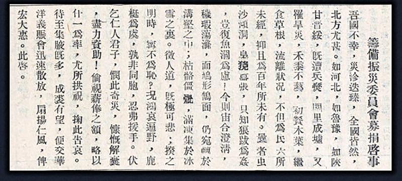 大學(xué)作為培育文明、教書育人的平臺,是傳播與踐行慈善文化的重要基地。仔細追溯清華大學(xué)的歷史就會發(fā)現(xiàn),清華人早在建校初期就逐步形成公益慈善傳統(tǒng),并與清華精神的培育與完善相輔相成。有明確資料證明,在1937年之前的早期清華歷史上曾進行過多次公益募捐活動,研討這些清華慈善實踐的史實,感悟蘊含其中的思想精華,對于清華大學(xué)的發(fā)展,仍然具有十分重要的現(xiàn)實意義。 早期清華所處的社會環(huán)境極其復(fù)雜,可以說,是在近代中國社會矛盾重重,外憂內(nèi)患頻頻的艱難時代中 “搞教育,做學(xué)問”,蹣跚前行,步步驚心。在不斷發(fā)生的天災(zāi)人禍面前,清華人一方面以堅持大學(xué)教育的發(fā)展為己任,一方面也以各種形式為“賑災(zāi)扶貧,抗敵勞軍”竭盡“匹夫報國”的盡心之力。這些慈善行動為百年清華的歷史留下了深刻的印記和寶貴的精神財富。 1928年組織旱災(zāi)捐助 根據(jù)史料記載,從1928年開始,中國北方發(fā)生過一場持續(xù)三年的罕見大災(zāi)荒。這場以旱為主,蝗、風(fēng)雪、雹、水、疫并發(fā)的巨災(zāi),以陜西、甘肅為中心,遍及山西、綏遠、河北、察哈爾、熱河、河南等八省,并波及山東、蘇北、皖北、湖北、湖南、四川、廣西的一部或大部,形成了一個面積廣袤的災(zāi)區(qū)。這場災(zāi)荒史稱“民國十八年年饉”,并被歷史學(xué)家列為“中國近代十大災(zāi)荒”之一。 在災(zāi)情被媒體持續(xù)曝光之后,清華師生也被這場災(zāi)難的嚴重程度所震驚,并迅速采取募捐賑災(zāi)行動。1928年12月20日,剛剛正式成立不久的國立清華大學(xué)設(shè)立“籌備賑災(zāi)委員會”,委員會由清華秘書長馮芝生、教務(wù)長楊金甫、外文系主任王立山教授、庶務(wù)科主任張仲魯、體育館主任馬約翰、學(xué)生評議部主席高琦、干事部主席張企泰以及學(xué)生代表李健吾、蘇宗固、容啟東、朱麗琛共11人組成,馮芝生任主席。時任校長羅家倫(1897—1969)參加了賑災(zāi)委員會第一次會議。會議對有關(guān)賑災(zāi)事宜進行決議,希望教職員捐出每月薪金的十分之一。羅家倫校長和王立山主任當場允諾捐出月薪金的十分之二,以為表率。 賑災(zāi)委員會于12月26日在《國立清華大學(xué)??返谝淮蔚禽d了募捐啟事,其中寫道:“吾國不幸,災(zāi)診迭臻,全國皆然,北方尤甚。……初餐木葉,繼食草根,流離狀況,不但為民六所未經(jīng),抑且為百年所未有……征人道,既極可悲;揆之明時,寧不為恥?況哀鴻遍野,鹿梃為虞,孰非同胞,忍弗援手。伏乞仁人君子,憫此奇災(zāi),慷慨解囊,盡力資助!倘視薪俸之額,略以什一為率,尤所拱祝。掬此告哀。待至集腋既多,成裘有望,便交華洋義賑會迅速散放,扇揚仁風(fēng),俾宏大惠?!鼻檎嬉馇?,躍然紙上! 在發(fā)出賑災(zāi)募捐啟事之后,賑災(zāi)委員會又于12月28日、31日連續(xù)在??系禽d有關(guān)災(zāi)情的報道和募捐辦法,同時在12月29日晚間在大禮堂組織了一場“賑災(zāi)游藝大會”,清華銅管樂隊參演,并請來一些當時著名的昆曲名家、魔術(shù)師、演奏家獻藝。所得門票價款悉數(shù)轉(zhuǎn)為賑災(zāi)款。這種募捐形式也可以看作是發(fā)展至今的各類“賑災(zāi)義演”的雛形。 在這次巨大災(zāi)情中,中國華洋義賑會、中國紅十字會、世界紅卍字會、中國濟生會等社會救助團體在賑災(zāi)工作中扮演著重要角色,發(fā)揮了舉足輕重的作用。這些社會救助團體主要通過募集與發(fā)放賑款、衣物,開辦粥廠,開設(shè)災(zāi)民收容所,發(fā)放貸款、種子等措施開展救濟工作。當年清華的賑災(zāi)善款主要是通過華洋義賑會轉(zhuǎn)賑。經(jīng)過三個月的募捐,清華全校師生員工募集的善款超過2000元。 1929年4月1日,??禽d中國華洋義賑救災(zāi)總會來函,告知收到清華全校師生員工募集的2225.58元善款,并已“歸入急賑??铐椣沦徏Z匯放”。在大規(guī)模募捐之后,在??先钥梢园l(fā)現(xiàn)有師生陸續(xù)捐款的報道,如外國語文系教授翟孟生一次捐款30大洋,舊大一學(xué)生捐款22元等。 1931年組織水災(zāi)捐助 在中國近代史上,1931年發(fā)生過一次迄今為止最嚴重的水災(zāi)。據(jù)史料稱,這一年中國氣候反常,大面積降雨。從5月下旬開始,長江、黃河、淮河、松花江、遼河、鴨綠江流域都持續(xù)降雨,時間竟長達三個月之久。水災(zāi)區(qū)域南到珠江流域,北至長城關(guān)外,東起江蘇北部,西至四川盆地,范圍之廣前所未有,造成的災(zāi)民數(shù)量起碼達到1億人,死亡人數(shù)約400萬,經(jīng)濟損失不計其數(shù)。饑餓、寒冷、傳染病的肆意侵襲,更多的人死于洪災(zāi)之后的饑荒與疾病,可謂“生靈涂炭、滿目瘡痍”。由此,這次災(zāi)害被列為世界十大最嚴重的自然災(zāi)害之一。 面對這場讓處于多事之秋的中華民族幾近于“九死之絕境”的天災(zāi),清華人再次表現(xiàn)出“仁者之心”,慷慨解囊。清華全體在冊教職員按照國民政府教育部統(tǒng)一部署,從九月、十月、十一月這三個月的薪金中按比例扣除水災(zāi)賑捐款。其中九月為2981元,十月為3021元,十一月為 2886.75元,三個月合計捐款為8888.75元。 1931年為東北抗戰(zhàn)捐款 20世紀中國遭受的最大災(zāi)難,是來自日本軍國主義發(fā)動的侵略戰(zhàn)爭。而這