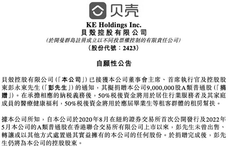 ■ 本報(bào)記者 皮磊 4月17日,貝殼發(fā)布自愿性公告稱(chēng),已接獲貝殼董事會(huì)主席、首席執(zhí)行官及控股股東彭永東的通知,其擬捐贈(zèng)900萬(wàn)股A類(lèi)貝殼普通股。按照17日下午收盤(pán)價(jià)51.95港元計(jì)算,此次捐贈(zèng)市值約為4.68億港元(約合人民幣4.4億元)。 根據(jù)公告,此次捐贈(zèng)在承擔(dān)相應(yīng)的納稅義務(wù)后,50%的稅后資金將用于居住行業(yè)服務(wù)者及其家庭成員的醫(yī)療健康福利,50%的稅后資金將用于應(yīng)屆畢業(yè)生等租客群體的租房幫扶。據(jù)悉,貝殼為此將設(shè)立專(zhuān)門(mén)機(jī)構(gòu),進(jìn)行長(zhǎng)期運(yùn)營(yíng)。 據(jù)貝殼方面介紹,當(dāng)前貝殼平臺(tái)聚集了幾十萬(wàn)名居住行業(yè)服務(wù)者,包括房產(chǎn)交易經(jīng)紀(jì)人、家裝安裝工、租賃管家等。通過(guò)兜住居住行業(yè)服務(wù)者及其家庭成員的醫(yī)療健康風(fēng)險(xiǎn),讓這些服務(wù)者更有尊嚴(yán)地提供服務(wù),更安心地工作,將有益于服務(wù)者長(zhǎng)期執(zhí)業(yè)以及為消費(fèi)者提供更優(yōu)質(zhì)的服務(wù)。此外,該筆捐贈(zèng)也將幫助應(yīng)屆畢業(yè)生等群體“租得起”“住得好”,緩解他們的住房問(wèn)題。 公開(kāi)資料顯示,貝殼集團(tuán)起源于2001年成立的鏈家房地產(chǎn)經(jīng)紀(jì)公司,2009年上線“鏈家在線”,2018年貝殼正式上線。2020年,貝殼在紐交所上市,成為中國(guó)居住服務(wù)平臺(tái)第一股。2022年,貝殼在港交所上市。2023年,其推出“一體三翼”戰(zhàn)略升級(jí),其中“一體”指新房、二手房交易,“三翼”指整裝、租賃和貝好家業(yè)務(wù)。 依托平臺(tái)優(yōu)勢(shì),近年來(lái)貝殼持續(xù)聚焦社區(qū)公益。 自2014年起,鏈家在全國(guó)各城市推出“高考休息站”,利用門(mén)店的休息空間、便民服務(wù)等資源為考生及家長(zhǎng)提供便利。此后,隨著更多經(jīng)紀(jì)品牌和門(mén)店加入,“高考休息站”升級(jí)為“高考服務(wù)站”,成為貝殼重點(diǎn)公益項(xiàng)目之一。 此外,自2018年發(fā)起“我來(lái)教您用手機(jī)”項(xiàng)目以來(lái),貝殼長(zhǎng)期關(guān)注社區(qū)場(chǎng)景中“一老一小”的需求。日前,貝殼公益先后啟動(dòng)“穩(wěn)當(dāng)當(dāng)計(jì)劃”和“銀發(fā)守護(hù)計(jì)劃”兩個(gè)新的助老公益項(xiàng)目。其中,前者主要聚焦老舊小區(qū)的老年人出行安全,為未安裝電梯的老舊小區(qū)加裝樓道內(nèi)所有樓層的靠墻扶手和樓梯首尾臺(tái)階警示標(biāo)識(shí)?!般y發(fā)守護(hù)計(jì)劃”則聚焦獨(dú)居老人的居家安全問(wèn)題。項(xiàng)目整合貝殼惠居的平臺(tái)技術(shù)優(yōu)勢(shì),為60歲及以上獨(dú)居老人免費(fèi)提供“智能硬件+平臺(tái)服務(wù)+意外保險(xiǎn)”守護(hù)方案,以及跌倒報(bào)警器和語(yǔ)音報(bào)警器等智能設(shè)備,同時(shí)搭建高效響應(yīng)平臺(tái),確保老人需求及時(shí)響應(yīng)。 自2021年起,貝殼面向全平臺(tái)各品牌、店?yáng)|、經(jīng)紀(jì)人和員工發(fā)起“善貝GO”公益行動(dòng),鼓勵(lì)志愿者通過(guò)捐獻(xiàn)步數(shù)兌換愛(ài)心資金,捐助公益項(xiàng)目。在助力鄉(xiāng)村振興方面,貝殼“經(jīng)紀(jì)人助農(nóng)計(jì)劃”借助平臺(tái)力量,將經(jīng)紀(jì)人家鄉(xiāng)的農(nóng)產(chǎn)品銷(xiāo)往全國(guó),并通過(guò)點(diǎn)對(duì)點(diǎn)專(zhuān)項(xiàng)指導(dǎo)、一對(duì)一直線幫扶模式,提供產(chǎn)品包裝上架、圖片展示、銷(xiāo)售服務(wù)等全流程指導(dǎo),助推鄉(xiāng)村產(chǎn)業(yè)振興?!爸凵鐓^(qū),在‘小美好’中創(chuàng)造‘大能量’?!迸碛罇|曾對(duì)媒體表示,貝殼發(fā)揮全國(guó)范圍內(nèi)的門(mén)店及服務(wù)者優(yōu)勢(shì),深入眾多社區(qū),成為公益“毛細(xì)血管”,在創(chuàng)造社會(huì)價(jià)值的同時(shí),為品牌價(jià)值觀的展現(xiàn)、口碑的建立、公益IP的培養(yǎng)形成助力。 |