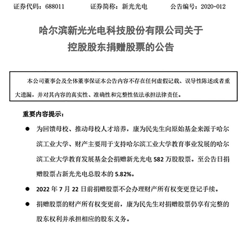 近年來股權(quán)捐贈(zèng)已成為企業(yè)家/企業(yè)支持慈善事業(yè)的共同選擇和未來趨勢(shì)。而由于經(jīng)濟(jì)波動(dòng)等不確定性影響因素增多,有關(guān)捐贈(zèng)承諾兌現(xiàn)和落地執(zhí)行情況也備受社會(huì)關(guān)注,由此引發(fā)的爭(zhēng)議一直未斷。 ■ 本報(bào)記者 皮磊 據(jù)多家媒體報(bào)道,哈爾濱新光光電科技股份有限公司(簡(jiǎn)稱“新光光電”)日前發(fā)布公告稱,公司近日收到嵩縣監(jiān)察委員會(huì)簽發(fā)的關(guān)于對(duì)公司控股股東、實(shí)際控制人、董事長(zhǎng)、總經(jīng)理康為民的《立案通知書》和《留置通知書》,康為民被實(shí)施留置措施。 針對(duì)上述情況,有媒體致電新光光電證券部嘗試了解更多細(xì)節(jié)。該公司工作人員回應(yīng)稱,“目前尚未獲得更多確切消息?!惫ぷ魅藛T表示,公司內(nèi)控完善,已召開臨時(shí)董事會(huì)落實(shí)工作安排,主營(yíng)業(yè)務(wù)與產(chǎn)品方向未變。 作為一家軍工電子信息企業(yè),該消息一經(jīng)發(fā)布即引發(fā)外界猜測(cè)。不過,在關(guān)注事件進(jìn)展的同時(shí),有關(guān)康為民曾向其母校哈爾濱工業(yè)大學(xué)捐贈(zèng)582萬股股票一事被翻出,甚至對(duì)該筆捐贈(zèng)的程序和動(dòng)機(jī)提出質(zhì)疑。事實(shí)上,近年來股權(quán)捐贈(zèng)已成為企業(yè)家/企業(yè)支持慈善事業(yè)的共同選擇和未來趨勢(shì)。而由于經(jīng)濟(jì)波動(dòng)等不確定性影響因素增多,有關(guān)捐贈(zèng)承諾兌現(xiàn)和落地執(zhí)行情況也備受社會(huì)關(guān)注,由此引發(fā)的爭(zhēng)議一直未斷。 582萬股股權(quán)捐贈(zèng)始末 據(jù)新光光電官網(wǎng)介紹,新光光電成立于2007年11月,注冊(cè)資本1億元,是東北地區(qū)科創(chuàng)板上市公司。該公司是一家將像方掃描成像制導(dǎo)技術(shù)、多光學(xué)波段合成技術(shù)等先進(jìn)光電技術(shù)應(yīng)用于光學(xué)制導(dǎo)類武器研制的企業(yè),致力于服務(wù)國(guó)防科技工業(yè)先進(jìn)武器系統(tǒng)研制等領(lǐng)域。公開資料顯示,康為民父子都是哈工大人,康為民本科和碩士都在哈工大就讀,隨后又在哈工大工作20多年,直到創(chuàng)辦上市公司。 2020年6月2日,新光光電發(fā)布關(guān)于控股股東捐贈(zèng)股票的公告。公告稱,公司于2020年6月1日接到控股股東康為民通知,其與哈爾濱工業(yè)大學(xué)教育發(fā)展基金會(huì)簽署了《捐贈(zèng)協(xié)議書》。根據(jù)公告,為回饋母校、推動(dòng)母校人才培養(yǎng),康為民向哈爾濱工業(yè)大學(xué)教育發(fā)展基金會(huì)捐贈(zèng)新光光電582萬股股票。至公告日,捐贈(zèng)股票占新光光電總股本的5.82%。按照當(dāng)時(shí)股價(jià)計(jì)算,這批股票價(jià)值高達(dá)2.4億元。 按照捐贈(zèng)協(xié)議,該筆捐贈(zèng)用于設(shè)立“松高·卓越工程師獎(jiǎng)助學(xué)金”、設(shè)立“松高·優(yōu)秀中青年教師貢獻(xiàn)獎(jiǎng)”、設(shè)立“松高·優(yōu)秀科技成果獎(jiǎng)”、設(shè)立“新興產(chǎn)業(yè)與技術(shù)發(fā)展創(chuàng)新基金”等。 2024年11月4日,新光光電發(fā)布關(guān)于控股股東捐贈(zèng)股份完成過戶暨股東權(quán)益變動(dòng)的提示性公告。公告稱,公司于2024年11月4日收到康為民通知,康為民與基金會(huì)的非交易過戶已經(jīng)在中國(guó)證券登記結(jié)算有限公司上海分公司完成過戶登記手續(xù),并出具了《證券過戶登記確認(rèn)書》。 公告顯示,本次股份捐贈(zèng)過戶登記完成后,康為民及其一致行動(dòng)人持有公司股份52348457股,占公司總股本的52.35%,仍為公司控股股東。本次股份捐贈(zèng)過戶登記完成后,哈爾濱工業(yè)大學(xué)教育發(fā)展基金會(huì)持有公司無限售流通股582萬股,占當(dāng)時(shí)公司總股本的5.82%。 該公告還特別指出,本次股份捐贈(zèng)未違反《上市公司收購(gòu)管理辦法》《上市公司股東、董監(jiān)高減持股份的若干規(guī)定》《上海證券交易所上市公司股東及董事、監(jiān)事、高級(jí)管理人員減持股份實(shí)施細(xì)則》《上海證券交易所科創(chuàng)板上市公司自律監(jiān)管指南》等有關(guān)法律、法規(guī)、部門規(guī)章及規(guī)范性文件和《公司章程》的規(guī)定,也不存在相關(guān)股東因本次股份轉(zhuǎn)讓而違反尚在履行的承諾的情形。 記者查詢哈爾濱工業(yè)大學(xué)教育發(fā)展基金會(huì)2024年度工作報(bào)告發(fā)現(xiàn),2024年度基金會(huì)收到捐贈(zèng)人康為民的非現(xiàn)金捐贈(zèng),合計(jì)金額為108950400元,捐贈(zèng)用途為“助力學(xué)??蒲心芰ㄔO(shè)”。 股權(quán)捐贈(zèng)已成趨勢(shì) 梳理近年來的大額捐贈(zèng)案例發(fā)現(xiàn),股權(quán)捐贈(zèng)已成為部分企業(yè)家/企業(yè)支持慈善事業(yè)的首要選項(xiàng): 2025年 7月 10日晚,寧德時(shí)代發(fā)布關(guān)于股東無償捐贈(zèng)部分公司股份的進(jìn)展公告。公告稱,公司股東及副董事長(zhǎng)李平及其配偶擬向上海復(fù)旦大學(xué)教育發(fā)展基金會(huì)捐贈(zèng)其持有的公司405萬股股票,上述股票均為無限售流通股。7月10日,捐贈(zèng)過戶手續(xù)已全部辦理完畢。按最新收盤價(jià)計(jì)算,該筆捐贈(zèng)價(jià)值超11