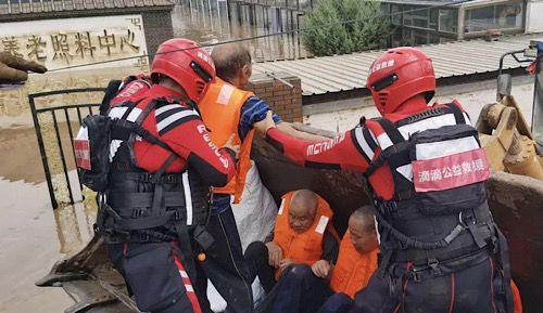 ▲救援隊(duì)員前往被洪水圍困的一個(gè)照料中心,轉(zhuǎn)移殘疾及患病的老人。圖片來源:“中國紅十字基金會”微信公眾號