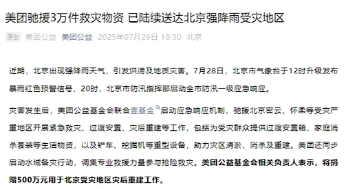 據(jù)“美團(tuán)公益”微信公眾號29日消息,災(zāi)害發(fā)生后,美團(tuán)公益基金會聯(lián)合壹基金啟動應(yīng)急響應(yīng)機(jī)制,馳援北京密云、懷柔等受災(zāi)嚴(yán)重地區(qū)開展緊急救災(zāi)、過渡安置、災(zāi)后重建等工作。美團(tuán)還同步啟動水域備災(zāi)行動,調(diào)集專業(yè)救援力量參與搶險(xiǎn)救災(zāi)。美團(tuán)公益基金會表示,將捐贈500萬元用于北京受災(zāi)地區(qū)災(zāi)后重建工作。