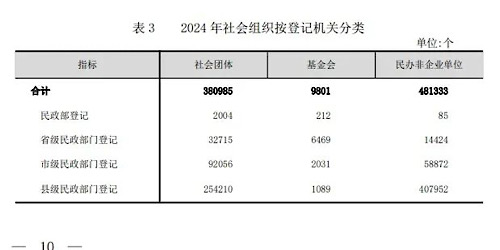 其中,在民政部登記的社會(huì)團(tuán)體有2004家,基金會(huì)有212家,民辦非企業(yè)單位85家;在省級(jí)民政部門(mén)登記的社會(huì)團(tuán)體有32715家,基金會(huì)6469家,民辦非企業(yè)單位14424家;在市級(jí)民政部門(mén)登記的社會(huì)團(tuán)體有92056家,基金會(huì)2031家,民辦非企業(yè)單位58872家;在縣級(jí)民政部門(mén)登記的社會(huì)團(tuán)體有254210家,基金會(huì)1089家,民辦非企業(yè)單位407952家。