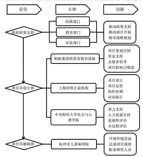 四是項目形成了證監(jiān)、教育及民政等政府部門,學(xué)術(shù)機構(gòu)、社會組織和企業(yè)等多方協(xié)同參與的公益合作生態(tài)。教育及民政部門提供政策空間和落地支持,為項目實施和推廣創(chuàng)造了條件;學(xué)術(shù)機構(gòu),如中央財經(jīng)大學(xué)社會與心理學(xué)院,負(fù)責(zé)智力支持和成效監(jiān)測,確保項目的科學(xué)性與有效性;社會組織上海佰特公益負(fù)責(zé)項目設(shè)計、資源整合和執(zhí)行落地,推動項目在福利院的有效實施;企業(yè)方螞蟻集團投資者教育基地,不僅提供資金支持,還派出志愿者參與項目。螞蟻集團的公益社團成員以及螞蟻基金的理財師以志愿者身份積極參與進來,他們具備豐富的市場經(jīng)驗和專業(yè)知識,在項目各個階段發(fā)揮了關(guān)鍵作用,為兒童提供了專業(yè)的金融知識和實踐指導(dǎo),由此形成項目資源生態(tài)網(wǎng)絡(luò)圖(見圖)。