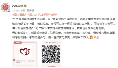 近日,西北大學(xué)官方微博發(fā)出的一則募捐倡議引發(fā)網(wǎng)友熱議。 今年,西北大學(xué)迎來(lái)建校119周年。該校校友總會(huì)號(hào)召校友、老師及學(xué)生,每月捐出一杯奶茶或一杯豆?jié){的錢(qián),支持母校發(fā)展。 倡議發(fā)出后,引來(lái)網(wǎng)友調(diào)侃西北大學(xué)是“中國(guó)最窮211”。 10月18日,西北大學(xué)工作人員回應(yīng)稱(chēng),校友捐贈(zèng)是大學(xué)經(jīng)費(fèi)的來(lái)源之一,很多大學(xué)都有這種渠道?!拔覀兪窃诜煽蚣芟逻M(jìn)行的,錢(qián)款的使用都會(huì)公示。” 募捐“一杯奶茶的錢(qián)” 10月14日,西北大學(xué)官方微博發(fā)布一則捐贈(zèng)倡議。該校校友總會(huì)對(duì)校友、老師及在校學(xué)生發(fā)出號(hào)召:在每月的6~9日將一杯奶茶(11.9元)或一杯豆?jié){(1.19元)的錢(qián)節(jié)省下來(lái)支持母校發(fā)展建設(shè),或者也可捐贈(zèng)任意金額,并在文字下方配有捐贈(zèng)二維碼圖片。 倡議發(fā)出后,引來(lái)不少?lài)^。對(duì)此,有網(wǎng)友表示“大為震驚”,并寫(xiě)道“不是說(shuō)缺一杯奶茶錢(qián)豆?jié){錢(qián)……倡議捐錢(qián)是長(zhǎng)久之計(jì)嗎”。也有人認(rèn)為,“雖然我也捐了,希望學(xué)校也越來(lái)越好,但是我覺(jué)得這個(gè)行為多多少少有點(diǎn)……” 其中也不乏網(wǎng)友調(diào)侃,“捐了,不要讓我沒(méi)學(xué)上”“俺們是真的樸”“中國(guó)最窮211,心酸,淚目”。 多的留言則是為西北大學(xué)“哭窮”:“在校到畢業(yè),感覺(jué)西大一直挺大方。這次雖說(shuō)是倡議,但這樣伸手,看來(lái)真的缺錢(qián)了吧,救救西大”“太慘了太慘了……” 撞名美國(guó)著名的西北大學(xué),我國(guó)西北大學(xué)盡管實(shí)力不凡,卻顯得“不太知名”。實(shí)際上,擁有119年歷史的西北大學(xué)是我國(guó)西北地區(qū)辦學(xué)歷史最為悠久的高等學(xué)府。 官方簡(jiǎn)介顯示,西北大學(xué)現(xiàn)為首批國(guó)家“世界一流學(xué)科建設(shè)高?!薄?guó)家“211工程”建設(shè)院校、教育部與陜西省共建高校。 在2017年的第四輪學(xué)科評(píng)估中,該校有2個(gè)學(xué)科進(jìn)入A類(lèi),16個(gè)學(xué)科進(jìn)入前30%,學(xué)科整體實(shí)力和水平較第三輪學(xué)科評(píng)估有了較大提升。地球科學(xué)、材料科學(xué)、化學(xué)、工程學(xué)、臨床醫(yī)學(xué)、藥理學(xué)與毒理學(xué)等學(xué)科還進(jìn)入ESI全球前1%行列。 中國(guó)“最窮”211? 由校友總會(huì)發(fā)起的一項(xiàng)募捐活動(dòng)也許不代表西北大學(xué)校方試圖以這種方式獲得“大力支持”。但這并不妨礙網(wǎng)友們“借題發(fā)揮”,為西北大學(xué)“實(shí)慘”的經(jīng)費(fèi)現(xiàn)狀而賣(mài)力“哭窮”。 當(dāng)前,陜西省共有8所“雙一流”高校,其中3所“一流大學(xué)建設(shè)高校”,即西安交通大學(xué)、西北工業(yè)大學(xué)、西北農(nóng)林科技大學(xué);5所“一流學(xué)科建設(shè)高?!?,即西北大學(xué)、西安電子科技大學(xué)、長(zhǎng)安大學(xué)、陜西師范大學(xué)、第四軍醫(yī)大學(xué)。 西北大學(xué)則是8所中唯一一所省屬高校,這成為影響其經(jīng)費(fèi)來(lái)源的重要因素。 同在陜西的教育部直屬高校西交大、工信部直屬高校西工大的2021年經(jīng)費(fèi)預(yù)算已躋身百億。其他4所陜西部屬“雙一流”——西電、西農(nóng)、長(zhǎng)大、陜師大的預(yù)算總經(jīng)費(fèi)分別為51.78億元、45.55億元、35.71億元、31.87億元。 作為陜西省屬高校,西北大學(xué)的預(yù)算經(jīng)費(fèi)為14.18億元,和上面幾所高校相去甚遠(yuǎn)。而這一數(shù)字已相較去年增加了5.73億,增長(zhǎng)百分比高達(dá)67.8%。 在東西部之間、西部區(qū)域省份內(nèi)的高校經(jīng)費(fèi)差距更加明顯。 2021年,同樣位于西部的四川省10所地方高校預(yù)算收入均超過(guò)10億元。再以省屬頭部高校為例,蘇州大學(xué)預(yù)算收入32.84億元,成都大學(xué)為24.3億元。 經(jīng)費(fèi)捉襟見(jiàn)肘,西北大學(xué)產(chǎn)出卻不低。 據(jù)西北大學(xué)校長(zhǎng)郭立宏透露,該校投入產(chǎn)出比位居全國(guó)高校前列。西北大學(xué)辦學(xué)經(jīng)費(fèi)投入位列95所一流學(xué)科建設(shè)高校中下游,高層次人才引育成效和科研產(chǎn)出則分列第8和第24位。 西北大學(xué)官微在一篇題為《西北大學(xué)2020年十大新聞》的文章披露,2020年,該校獲批國(guó)家級(jí)哲學(xué)社會(huì)科學(xué)科研項(xiàng)目41項(xiàng),其中重大重點(diǎn)項(xiàng)目8項(xiàng);教育部人文社科項(xiàng)目20項(xiàng);獲批國(guó)家自然科學(xué)基金135項(xiàng),其中重大重點(diǎn)項(xiàng)目6項(xiàng),獲批國(guó)家重點(diǎn)研發(fā)計(jì)劃課題8項(xiàng);科研到款經(jīng)費(fèi)3.58億元,其中理工類(lèi)縱向項(xiàng)目到款2.26億元,創(chuàng)歷史新高。 2021年8月,西北大學(xué)公布2021年度國(guó)家自然科學(xué)基金項(xiàng)目申請(qǐng)結(jié)果。在申報(bào)的各類(lèi)項(xiàng)目579項(xiàng),共有144項(xiàng)項(xiàng)目獲得資助,獲批直接經(jīng)費(fèi)6944萬(wàn)元,項(xiàng)目資助率24.87%,超過(guò)基金委平均資助率8個(gè)百分點(diǎn)。獲批項(xiàng)目數(shù)較上